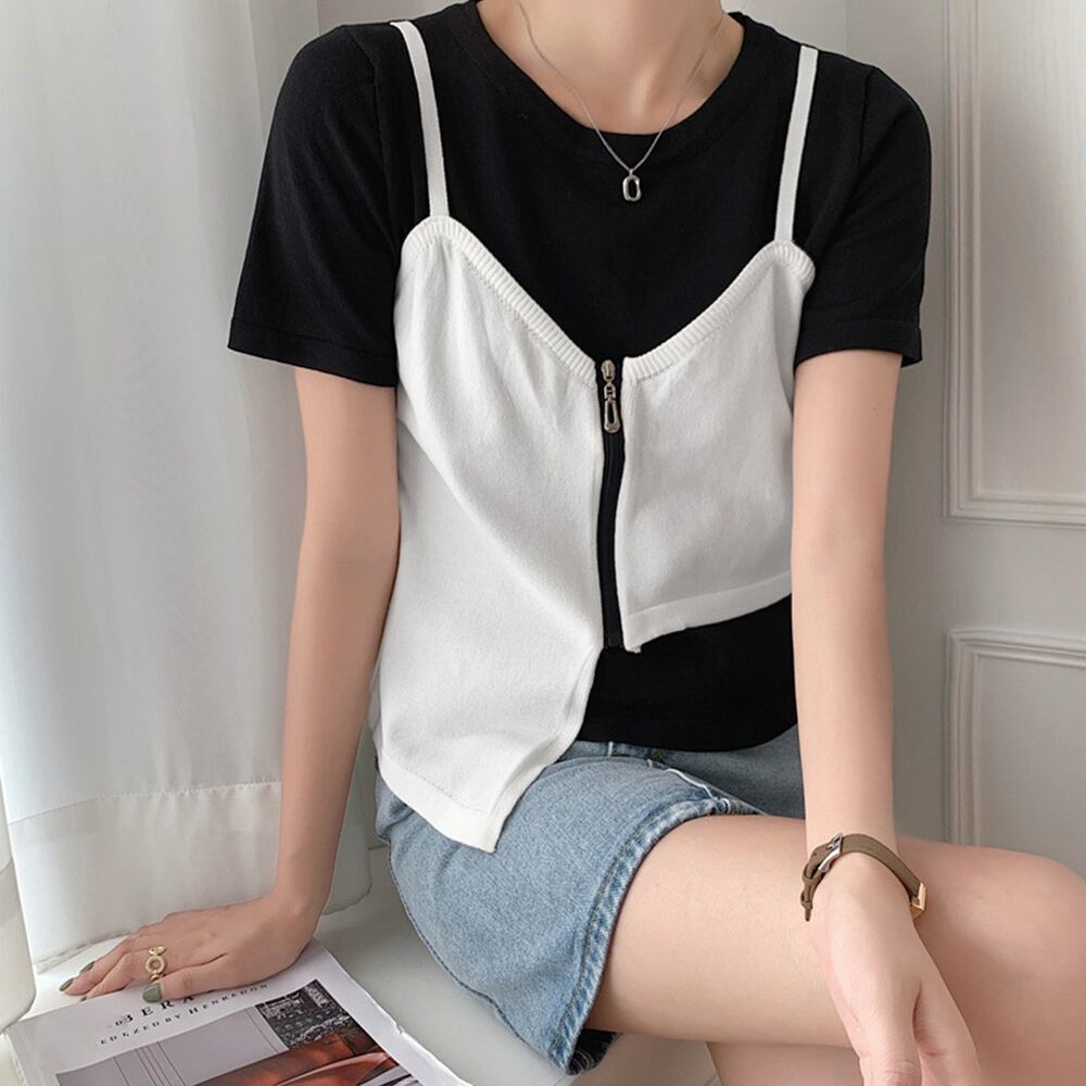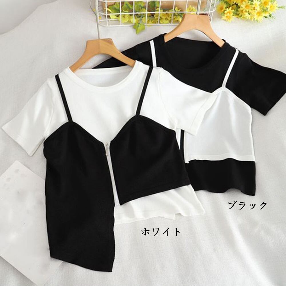 レディース バイカラー レイヤード風ニットソー 韓国 春夏 カットソー 重ね着風 トップス ラウンドネック 半袖
