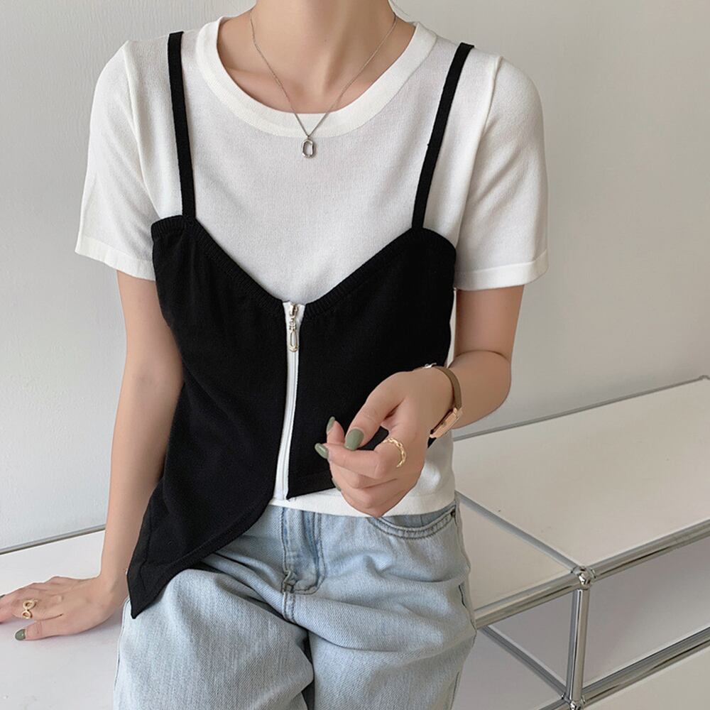 一枚でスタイリングがオシャレにきまるキャミソール付きのアシンメトリーデザインのドッキングニットTシャツ