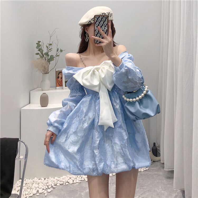 sweet系 蝶結び ダイヤモンドスリングオフショルダー 長袖 スリムワンビース