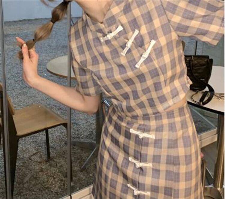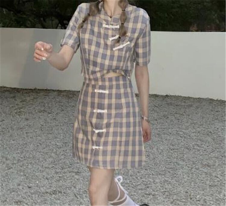 スカート 2点セット 韓国 デザインセンス レーヨン 縫付 ガーリー 気質 チェック柄 中国の風